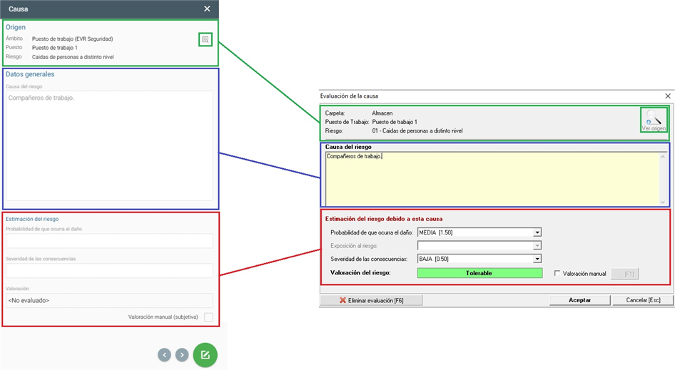- Causas. Dentro de esta ventana se nos muestra la información relacionada con el origen, los datos generales de la causa y valorar la estimación del riesgo cuando se produce por esta causa. En la siguiente imagen podemos ver el símil de Prevengos con la Webapp, donde apreciamos que los campos son los mismos: