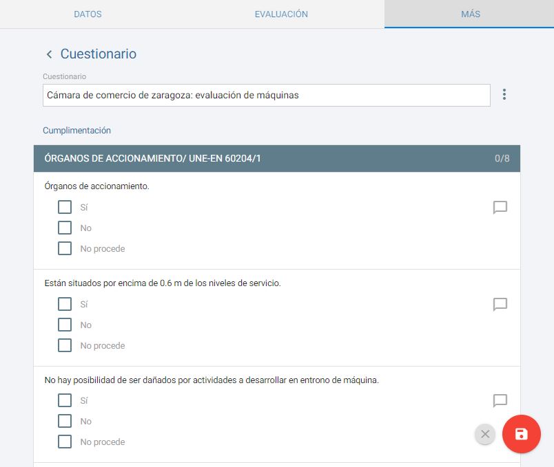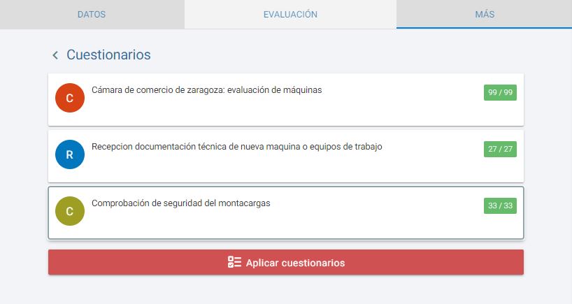 Esta herramienta permite al usuario aplicar cuestionarios o listas de chequeo a los elementos evaluables (estos cuestionarios sólo pueden utilizarse en las evaluaciones de riesgos o evaluaciones de seguridad). Los añadimos desde su correspondiente mantenimiento, si tenemos dudas sobre este mantenimiento podemos consultar su correspondiente manual aquí.