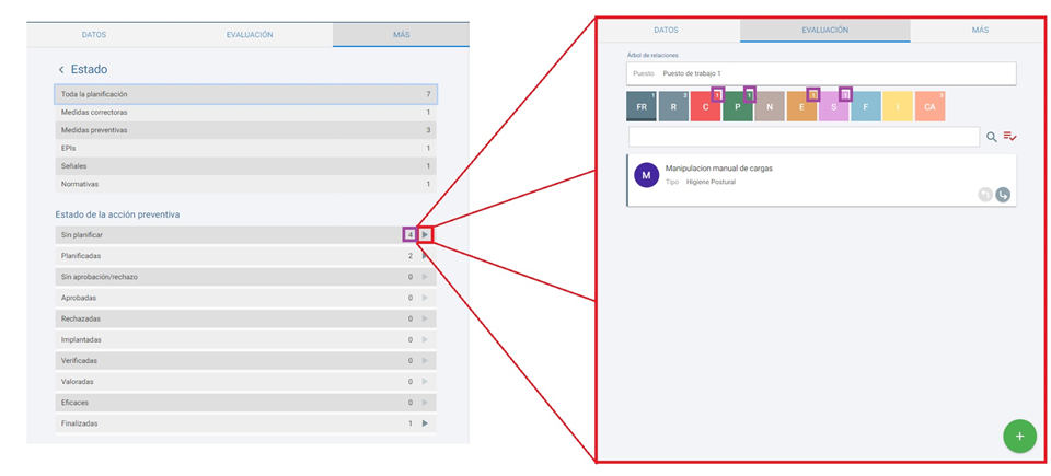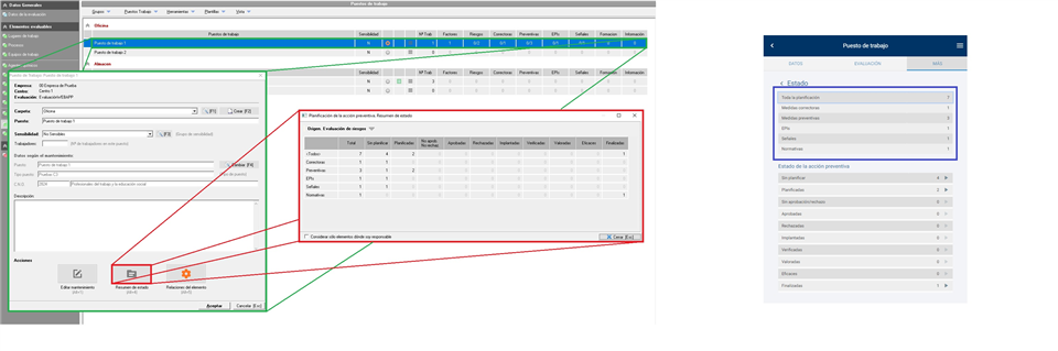 La ventaja que tenemos en la Webapp (imagen de la derecha) es que podemos filtrar y acceder a los elementos en función de su estado. Por ello, la parte superior (resaltada por un recuadro azul) es realmente un filtro, en el que podemos seleccionar el tipo de elemento que queramos para que en la parte inferior nos indique el estado de la acción Preventiva. Por ejemplo, podemos seleccionar "Medidas correctoras" y en la parte inferior se mostrarán la cantidad de medidas en cada uno de los estados, donde podemos hacer clic en el botón