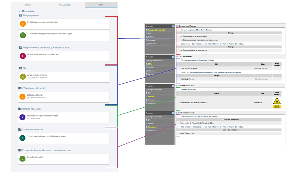 Dentro de esta pestaña veremos un listado de los riesgos, EPIs, señales, formación e información que afectan al elemento donde nos encontramos. A lo largo de este manual hemos visto la forma de evaluar un elemento evaluable (un puesto, un equipo,...) y también como relacionar este elemento con otro dentro de la misma evaluación. Cuando estas relaciones son directas, el elemento al que le afectan hereda la evaluación del que le está afectando.