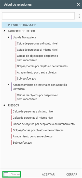 Tal y como se aprecia, se distingue un sombreado azul claro en la posición del esquema que se tiene seleccionada, en este caso es el mismo puesto de trabajo, por lo que se visualizarían todos los elementos de evaluación. Ahora bien, la marca "Directos" de la esquina inferior izquierda resaltada verde mostraría en este caso solamente los elementos asociados directamente al elemento, y por lo tanto los que son planificables (medidas, epis, señales, formación e información). Para recordar la ramificación del árbol de relaciones en Prevengos, en la siguiente imagen se distinguen en la parte inferior los elementos asociados directamente