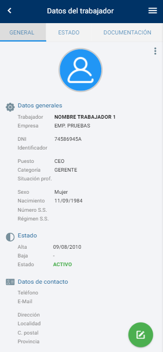 En el caso del trabajador se abrirá la ficha del trabajador donde podrá comprobar sus datos y estado en las diferentes áreas, tal y como se explica en este manual