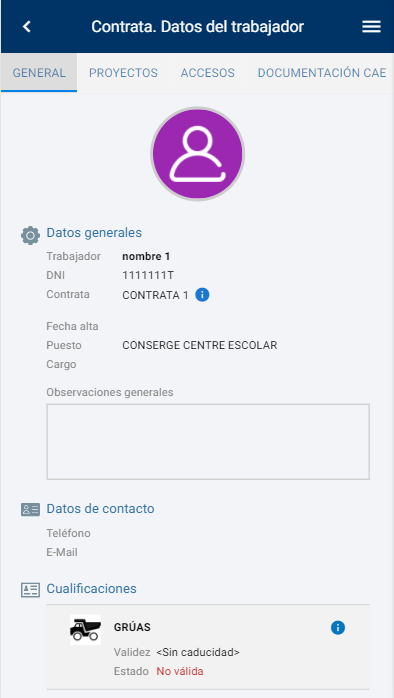 Si identifica un trabajador de una contrata, podrá ver su ficha de datos, proyectos en los que participa, acceos y el estado de su documentación.