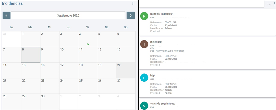 - Modo Listado. Podemos ver directamente un listado de las incidencias en función de los parámetros establecidos en la configuración, haciendo clic sobre la incidencia para editarla o con la posibilidad de crear una nueva.
