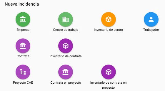 desde el cual podemos crear una incidencia nueva. Tras hacer clic sobre el icono tendremos que elegir el elemento sobre el cual vamos a crear la incidencia, pudiendo ser Empresa, Centro de trabajo, Inventario de centro, trabajador, contrata, inventario de contrata, proyecto CAE, contrata de proyecto o inventario de contrata en proyecto. Una vez seleccionado se abrirá la nueva ventana donde podemos crear la incidencia