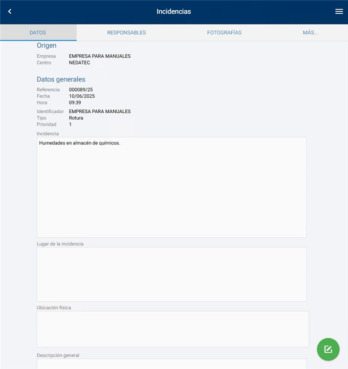 - Datos. Dentro de esta pestaña estableceremos el elemento al cual va dirigida la, las fechas de la misma así como el tipo y prioridad. Seguidamente disponemos de cuadros de texto donde exponer la incidencia, el lugar de la misma, ubicación física (pudiendo seleccionarla con el icono