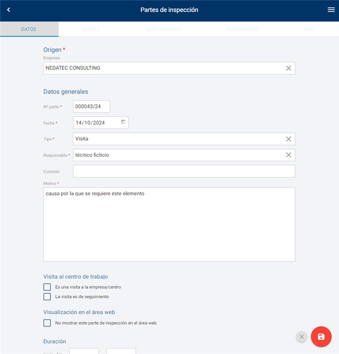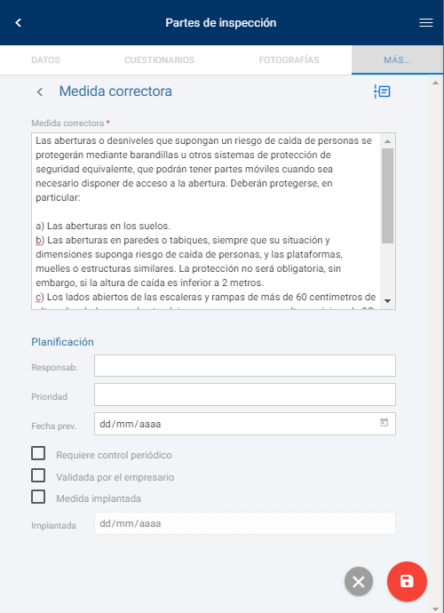 Este apartado contiene los campos Elementos inspeccionados, Deficiencias, Soluciones y Conclusiones para su cumplimentación, pero todo depende de la configuración Partes de inspección. Campos Temas tratados, Deficiencias, Soluciones y Conclusiones en formato RTF, tal como lo indica la guía de Configuraciones del módulo de prevención técnica.