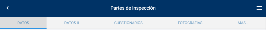 Una vez grabado el parte de inspección, se habilitarán el resto de apartados del mismo para que podamos continuar cumplimentando datos. Estos apartados están disponibles en la partes superior de la pantalla.