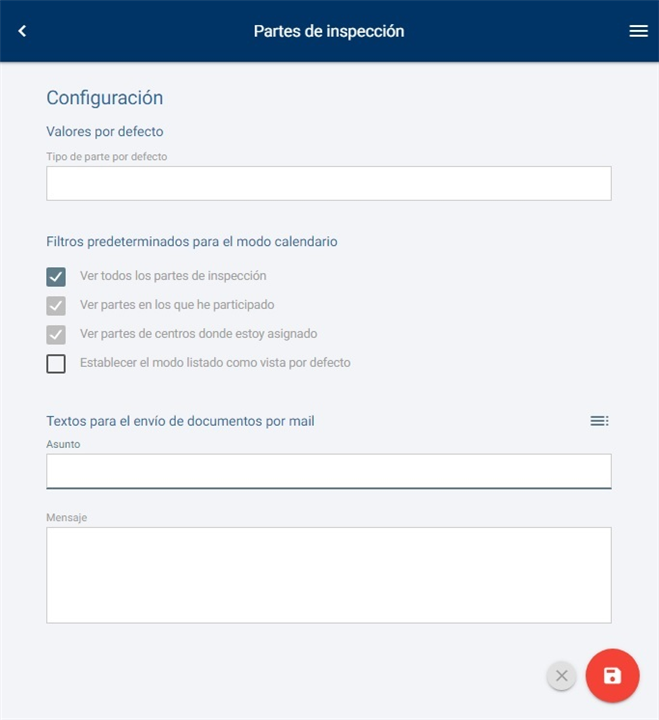 Además de cambiar el modo de vista por defecto, encontrará otras opciones de configuración como aplicar filtros sobre los partes que se cargarán por defecto en el modo calendario, configurar un tipo por defecto, o definir el asunto o el mensaje que se enviará por defecto cuando envíe un parte de inspección por email.