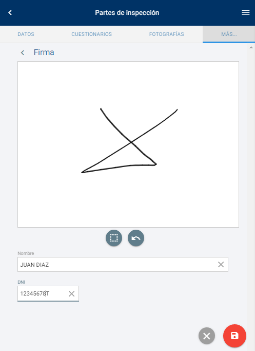 El usuario disponde de un apartado de firma, donde puede solicitar al cliente que firme el parte de inspección. Este apartado se encuentra también en el bloque 'MÁS...'.
