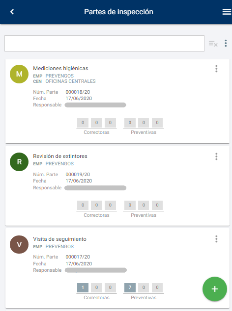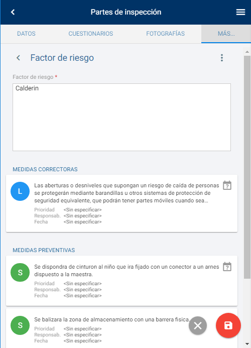 A estos factores de riesgos podrán relacionar medidas correctoras y preventivas. Si acceden a uno de los factores que hayan incorporado al parte de inspección y pulsan sobre el icono de los tres puntos grises que hay en la parte superior derecha, podrán acceder a los mantenimientos de medidas correctoras o preventivas de Prevengos y añadir estas medidas a estos partes.