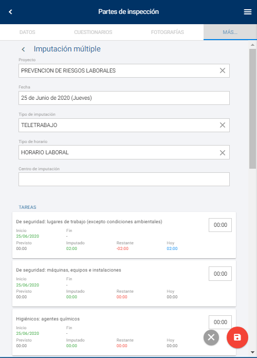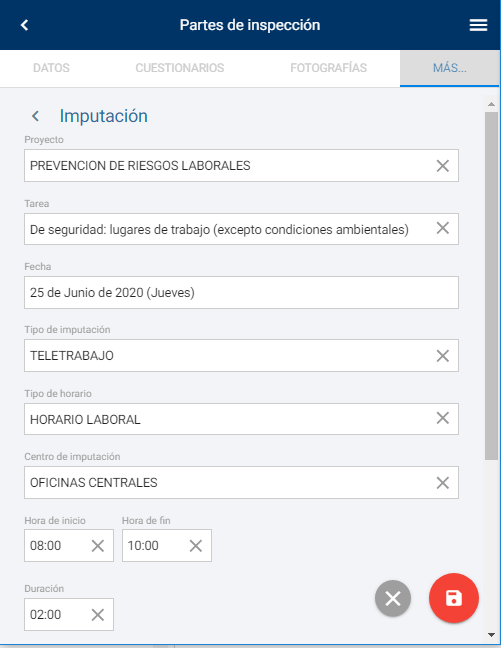 Otra acción que el usuario puede llevar a cabo desde el parte de inspección es la imputación de tiempos sobre los proyectos de horas en los que esté asignado. Para poder realizar esta imputación, es necesario que existan proyectos en los que el usuario esté asignado para imputar tiempos, de lo contrario, no podrá realizar imputaciones.