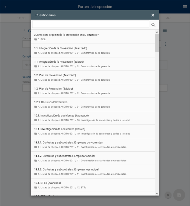 Al añadir el cuestinario al parte de inspección se abrirá directamente para que el usuario pueda comenzar a cumplimentarlo, en caso de que quiera posponer la cumplimentación para otro momento, puede salir del cuestionario pulsando el botón
