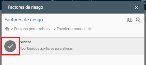 , accederán a este mantenimiento. Una vez en el mantenimiento tendrán que pulsar sobre la carpeta en la que se encuentran los factores de riesgo y seleccionar los que quieren añadir pulsando sobre el icono circular que tienen en la parte izquierda de cada factor.