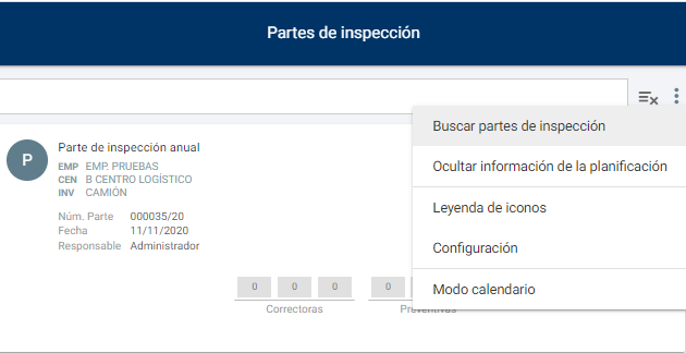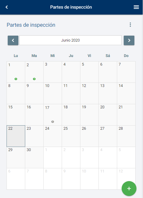 Los partes de inspección podrán visualizarlos en modo calendario o modo listado. Por defecto, la primera vez que accedan lo verá en forma calendario pero podrá alternar entre ellos pinchando en el menú de los tres puntos, tal y como explicaremos más adelante.