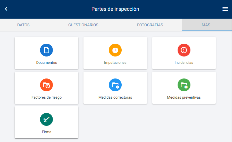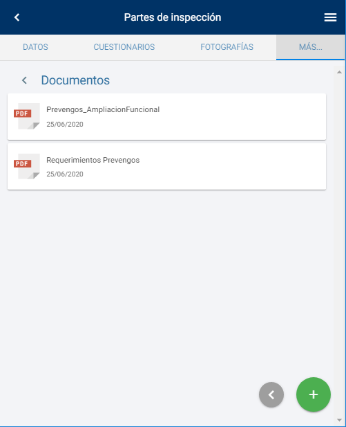 El usuario podrá adjuntar también documentación al parte de inspección de forma similar a como hemos visto en el apartado anterior con las fotos. Para ello, una vez dentro del parte de inspección debe pulsar sobre el apartado 'MÁS...' que encontrará en la parte superior de la pantalla y se le abrirán nuevos botones para añadir apartados al parte.