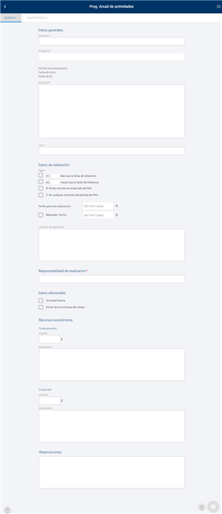 accedemos a la ficha de la propia actividad donde tenemos dos pestañas principales, general y responsables. En el momento de creación un popup nos preguntará el tipo de actividad que queremos crear, pudiendo seleccionar técnica (empresa), técnica (centro) y medicina (empresa).