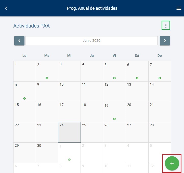 Desde esta herramienta de la Webapp el técnico puede trabajar con las actividades incluidas en el programa anual de las empresas, tanto si es el responsable como si no, en función de la configuración que establezcamos. Cuando accedamos veremos el calendario (imagen que vemos a continuación) donde se marcará las actividades que se encuentran en esos días así como el botón para configurar la vista (recuadro verde de la imagen) donde se puede alternar entre modo calendario y modo listado. Desde el botón situado en la parte inferior derecha (recuadro rojo) podemos crear una actividad nueva, eligiendo entre técnica o medicina.