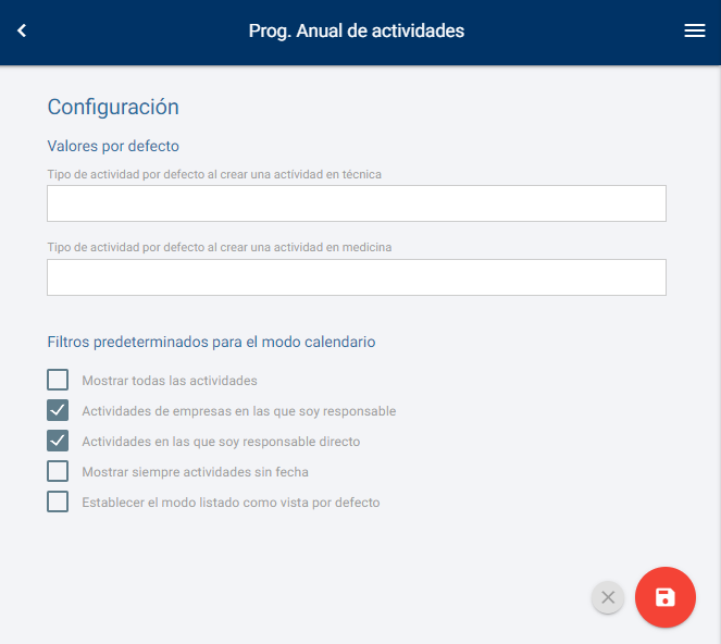 En la configuración se puede establecer el tipo de actividad por defecto que se asigna tanto al crear una actividad en técnica como en medicina. También podemos aplicar unos filtros cuando tenemos la vista por calendario activa, con el fin de que no muestre todas las actividades, solo las de las empresas donde somos responsables y/o aquellas donde somos responsables directos. Esta configuración también se aplicará a la Agenda del día. Podemos elegir también que nos muestre las actividades sin fecha y que cuando accedamos al área de Programa Anual de la Webapp se nos muestre el modo listado o el modo calendario.