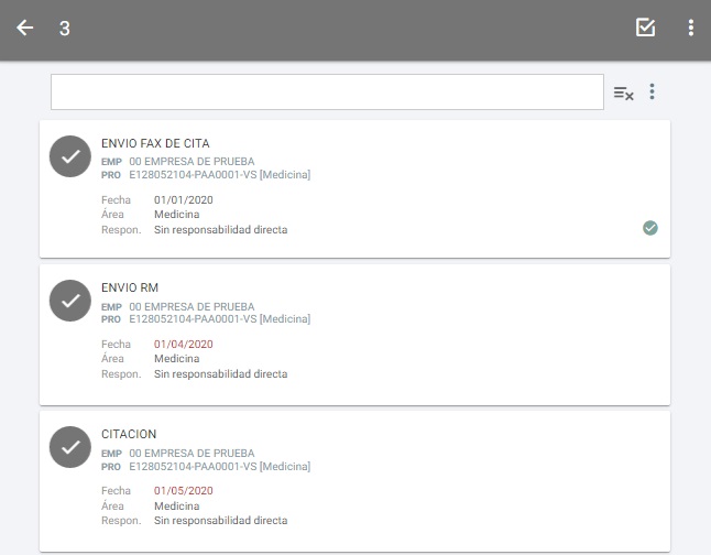 y nos permite realizar consultas de actividades filtrando por empresa, centro, datos de la actividad (si es de empresa o centro y si es de medicina o técnica), estados, tipo, ...
