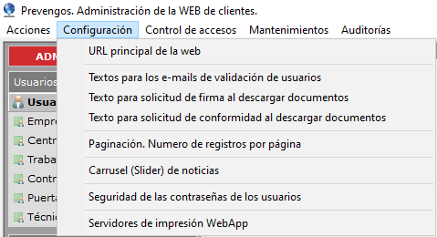 La web dispone de una serie de configuraciones para establecer requisitios de conexión y seguridad, dicha parametrización debe realizarla desde el admnistrador web con el menú "Configuración"