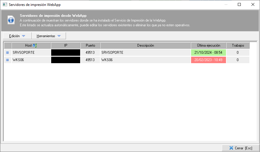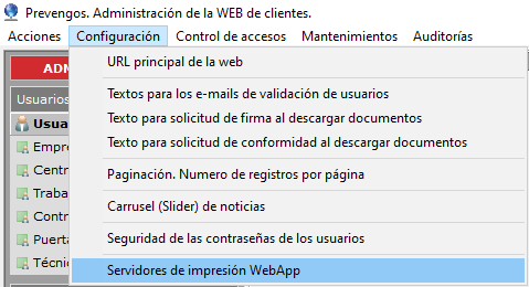 Este formulario lista los servidores en los que se ha instalado el servicio de impresión para el portal web del técnico (Prevengos ImpWS).