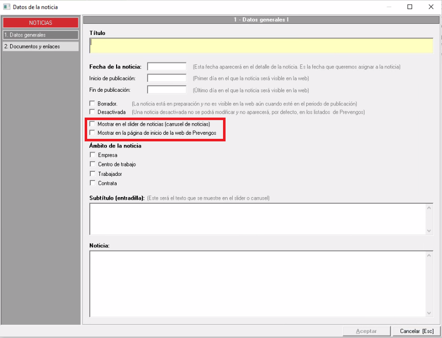 Para que la noticia se muestre en el slider o en la página independiente de noticias, en la ficha de la noticia deberá marcar estas opciones, según proceda.