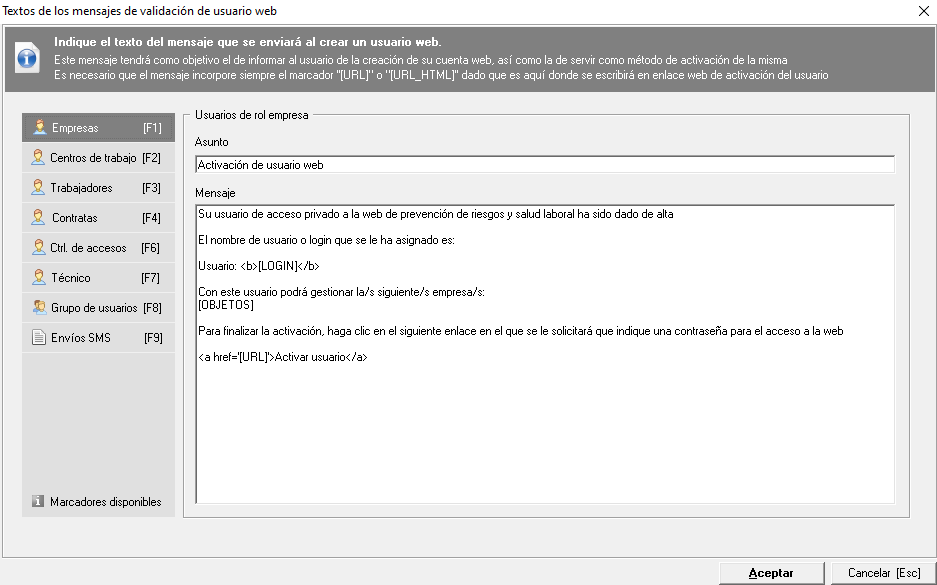 El asunto del mensaje que se manda a los usuarios puede modificarlo, teniendo en cuenta que el marcador [EMPRESA] se sustituirá por el nombre de la empresa o contrata a la que se le manda el aviso.