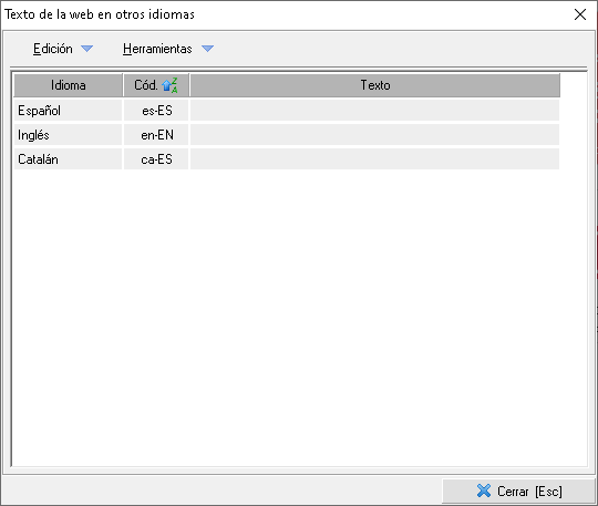 Habilitando el formulario para registrar los códigos HTML para los idiomas con el menú 'Idiomas > Nuevo idioma'. Actualmente los idiomas que dispone el portal web son: