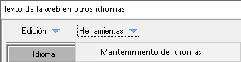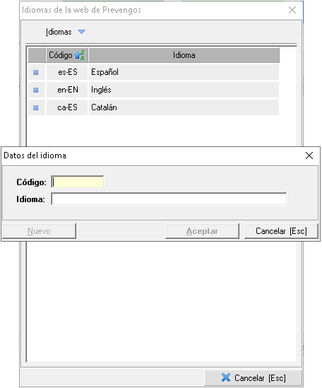 El menú 'Herramientas > Mantenimiento de idiomas' le permitirá registrar todos los idiomas que tenga definidos en el portal web, en la ruta '...\PREVENGOS\IIS\PrevengosWeb\idiomas'.