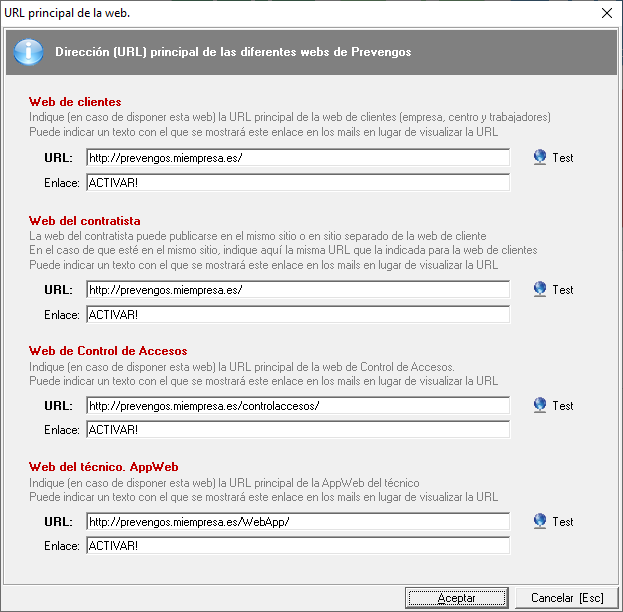 En este apartado ha de indicar la URL con la que se ha registrado el portal web, puede ser un dominio tipo 'prevengos.miempresa.es' o una IP pública. La url aquí definida es la que se inserta en los emails que se reciben los usuarios para la activación de su usuario web.