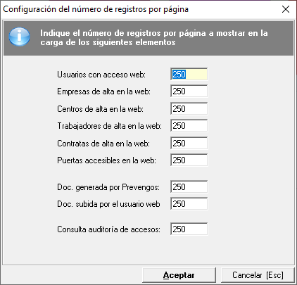 En este apartado se configura la paginación de la información en la aplicación, es decir, el número de registros por página que deseamos visualizar en cada apartado.