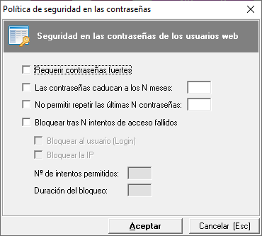 Este apartado permite configurar la seguridad de las contraseñas de los usuarios web: