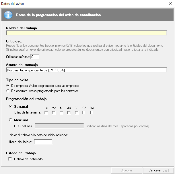 El aviso se puede programar para que notifique revisando todos los documentos que se le requieren a las contratas, o filtrando por la criticidad del documento. Por ejemplo, puede programar un envío diario para los documentos que tengan una criticidad 5 o superior y un envío semanal para todos. Es decir, si a una contrata le faltan documentos de criticidad alta (se consideran que son más importantes) se le mandan avisos más frecuentes, sin embargo la falta de documentos menos importantes solo se manda una vez por semana. Si indica en el campo Criticidad mínima: 0, se mandará el aviso sin mirar este campo, por tanto se avisará de todos los documentos que tenga pendiente. La criticidad del documento se configura en el mantenimiento de documentos CAE.