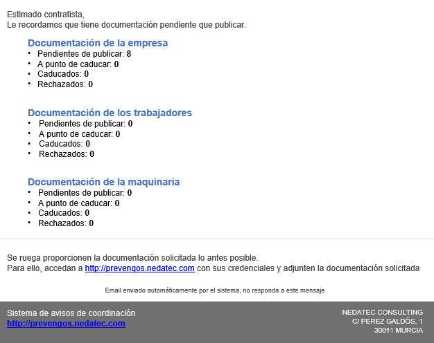 Para la coordinación de actividades empresariales, dispone de este apartado para configurar los avisos a las contratas y/o empresas sobre el estado de su documentación CAE. Este aviso envia un email a todas las contratas/empresas con usuario web indicandole si tienen documentación pendiente de publicar, caducada o próxima a caducar (si tienen la documentación al día no envia el correo). En el caso de aviso a las empresa, enviará un resumen de toda la documentación pendiente, caducada y rechazada de las contratas que participan en sus proyectos y en caso de las contratas recibirán un correo con un resumen de toda la documentación pendiente, caducada y rechazada de todos los proyectos en los que participe.
