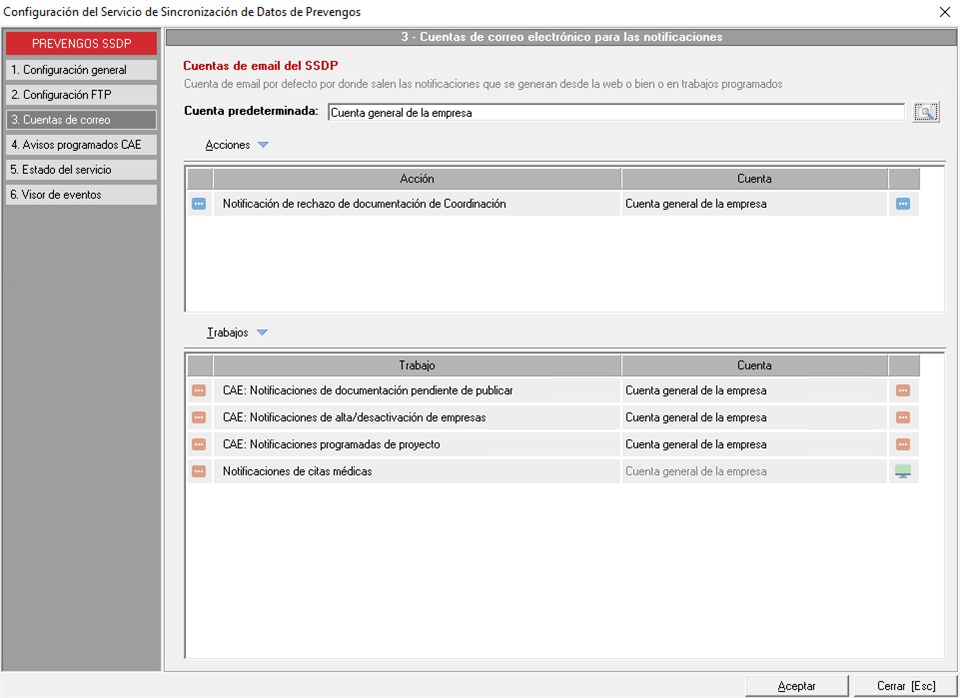 Por otro lado, dispone de acciones y trabajos que pueden ser canalizados a través de otra cuenta. Por ejemplo, la acción manual de rechazar una documentación relativa a Coordinación, puede ser asignada a la cuenta que necesite. Además, los trabajos automatizados como los Avisos programados de Coordinación, puede también asociarse a la cuenta de correo que necesite.