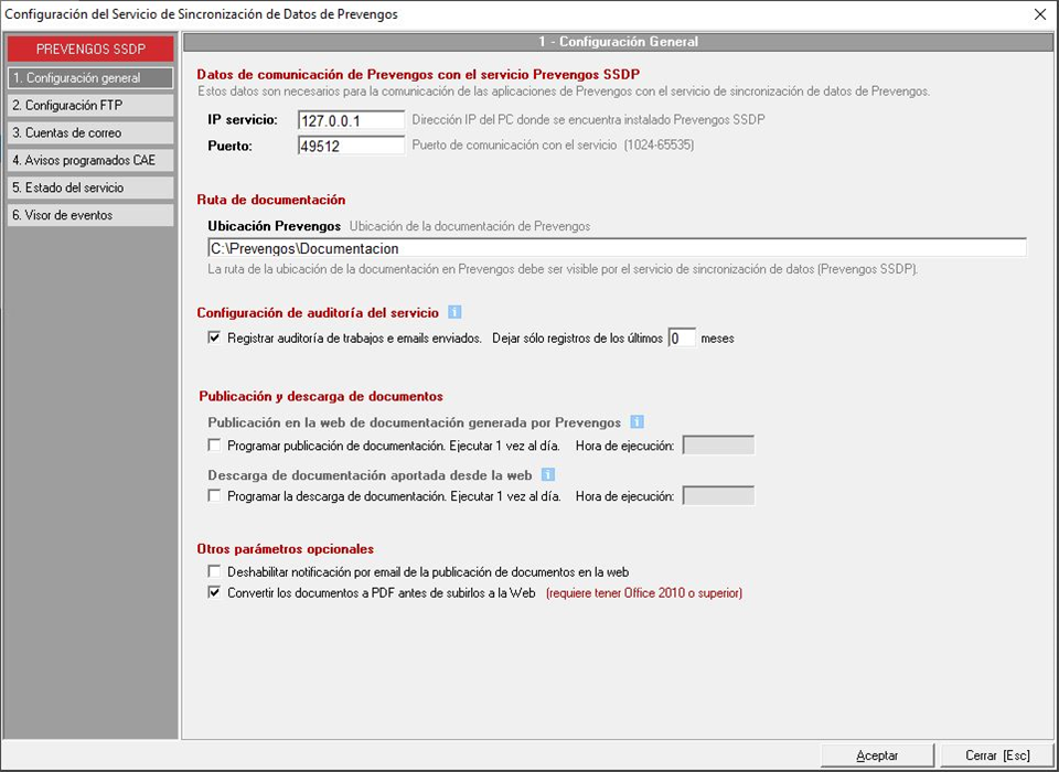 El SSDP es un servicio que se instala en el servidor y administra ciertas tareas ejecutadas desde Prevengos. Esto incluye la publicación de documentación desde Prevengos a la web, la descarga de documentos que los clientes han subido a la web y la sincronización de información entre Prevengos y otras plataformas, como la de firmas electrónicas externas o Moodle. Una configuración adecuada es crucial para el funcionamiento óptimo de estos procesos entre Prevengos y dichas herramientas.
