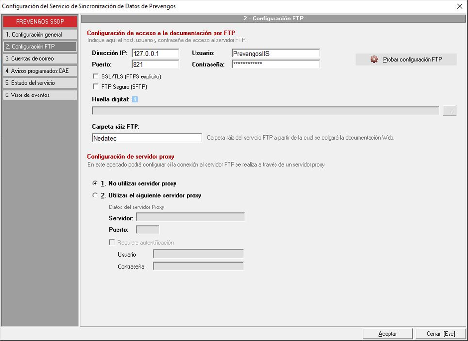 - Configuración de servidor proxy. Si la conexión al servidor FTP se realiza a través de proxy, en este apartado se podrá definir la configuración del mismo para su conexión.