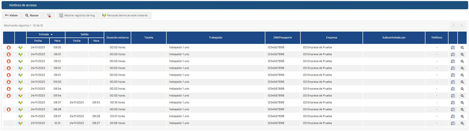 . En el caso de entradas validadas no se mostrará ningún icono. Para cada uno de los registros podemos ver la fecha/hora de la salida o entrada, en caso de ser una salida nos indica la duración del trabajador en la estancia.
