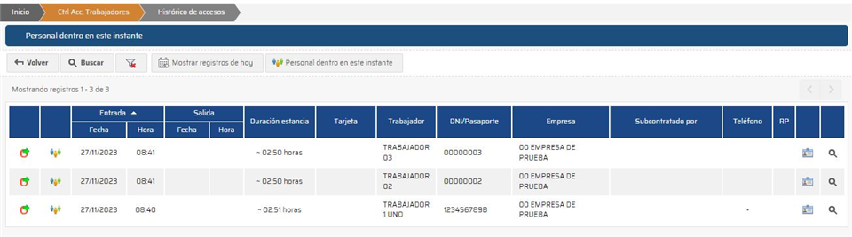 Como podemos apreciar, se muestra un listado con los trabajadores dentro en este momento. Con el primer icono podemos identificar si la entrada ha sido forzada o normal, la fecha y hora de entrada, trabajador, DNI, empresa, etc. En esta vista no hay datos de salida ni duración, ya que esta informació sólo se muestra cuando se registra la salida.