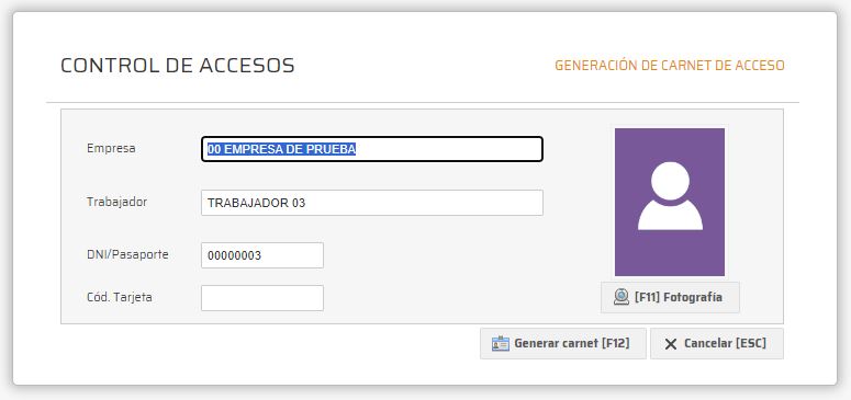Prevengos dispone de la creación de carnets de acceso para su validación en la web de control de accesos. Recordemos que en el apartado anterior, cuando veíamos como se puede identificar a un trabajador, tenemos diferentes opciones: por nombre, por DNI o por código de tarjeta. Ésta última opción es la referente a dar entrada mediante estos carnets. Desde esta herramienta podrá comprobar el carnet de la última persona que ha accedido, lo cual se nos muestra de manera similar a la siguiente imagen: