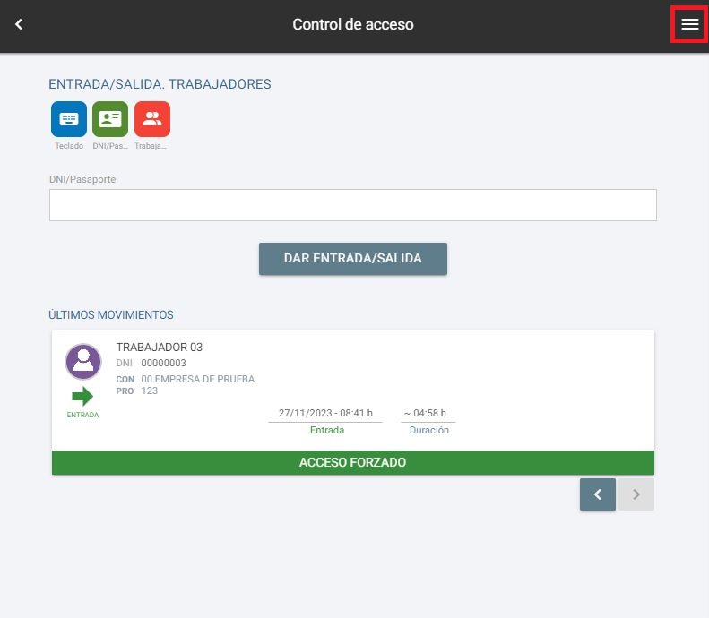 - Acceso de trabajadores. Entramos en el apartado donde gestionamos la entrada/salida de trabajadores.