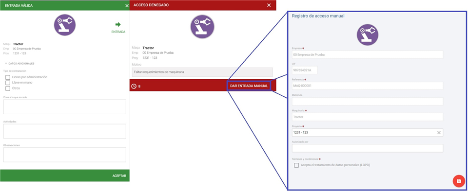 Todo lo contrario, si la entrada es denegada, por el motivo que sea. Se muestra la imagen central, en la cual nos informa de que el acceso esta denegado. En caso en que la puerta de acceso la tengamos configurada con la posibilidad de forzar la entrada, tendremos disponible el botón "Dar entrada manual" con el que abrimos el formulario que vemos en la imagen de la derecha, una vez cumplimentado permitiremos, y así quedará registrada, la entrada de la maquinaria al centro de trabajo.
