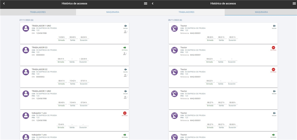 . Para cada uno de los registros podemos ver la fecha/hora de la salida o entrada, en caso de ser una salida nos indica la duración del trabajador/maquinaria en la estancia.