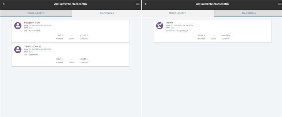 Dentro de este apartado podemos comprobar, según las entradas y salidas registradas, que trabajadores o maquinaria se encuentra actualmente dentro del centro de trabajo. La pantalla que se muestra es similar a las siguientes imágenes en función de si seleccionamos vista de trabajadores o de maquinaria: