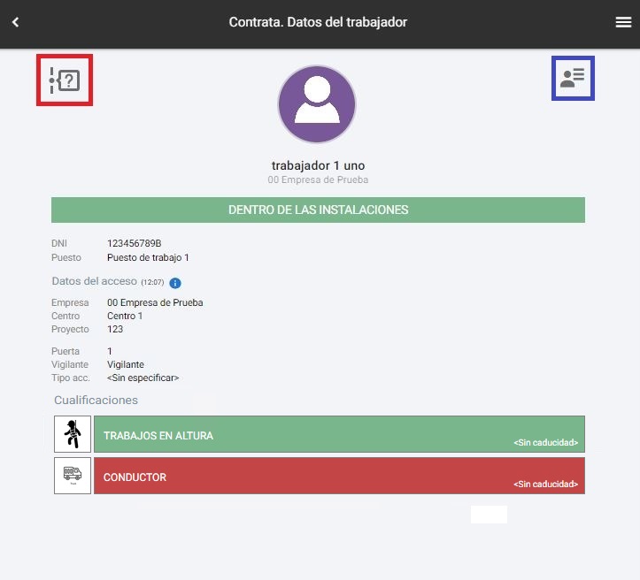 Como podemos apreciar en la pantalla que se muestra nos informa de los datos principales del trabajador, si está o no dentro de las instalaciones, empresa a la que pertenece, etc. Vamos a centrarnos en los iconos que se muestran en la parte superior, en concreto el situado en la parte izquierda la cual nos indica el tipo de contrato si se ha indicado como dato adicional a cumplimentar a la entrada al centro (dentro de la puerta de acceso). Este icono puede tener diferentes estados en función del contrato: