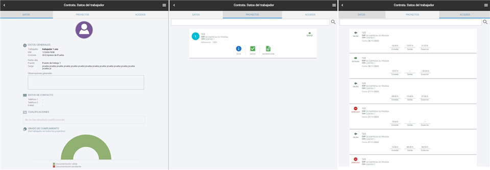 Este botón nos indica los datos relativos al proyecto, entre los que se encuentra el grado de cumplimiento de la documentación requerida, donde podemos apreciar la cantidad y porcentaje de documentos validados y pendientes.- El siguiente icono puede ser diferente en función de si el trabajador/maquinaria puede acceder o no. En caso afirmativo el icono que se muestra es