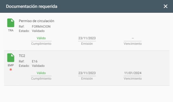 si toda la documentación pendiente está en regla. Si hacemos clic a este botón se muestra un listado de todos los requerimientos asociados al elemento con el estado de cada uno de ellos, similar a la siguiente imagen.