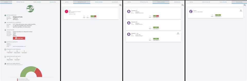 Por último, encontramos la pestaña de maquinaria, muy similar a la anterior del trabajador donde vemos un listado de la maquinaria existente en la contrata, su datos generales, proyectos donde está incluida y el grado de cumplimentación. Al hacer clic se muestra la ficha de la contrata, muy similar a la comentada en el apartado anterior del trabajador.
