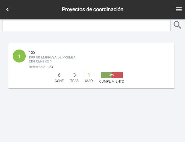 Cuando accedamos a este apartado se nos muestra un listado de los proyectos de coordinación existentes en la puerta de acceso donde nos encontramos. En dicho listado se indica el nombre del proyecto, empresa centro, referencia y un indicativo del número de contratas trabajadores y maquinaria incluida, así como el grado de cumplimentación de sus requerimientos. La imagen que se muestra es similar a la siguiente captura: